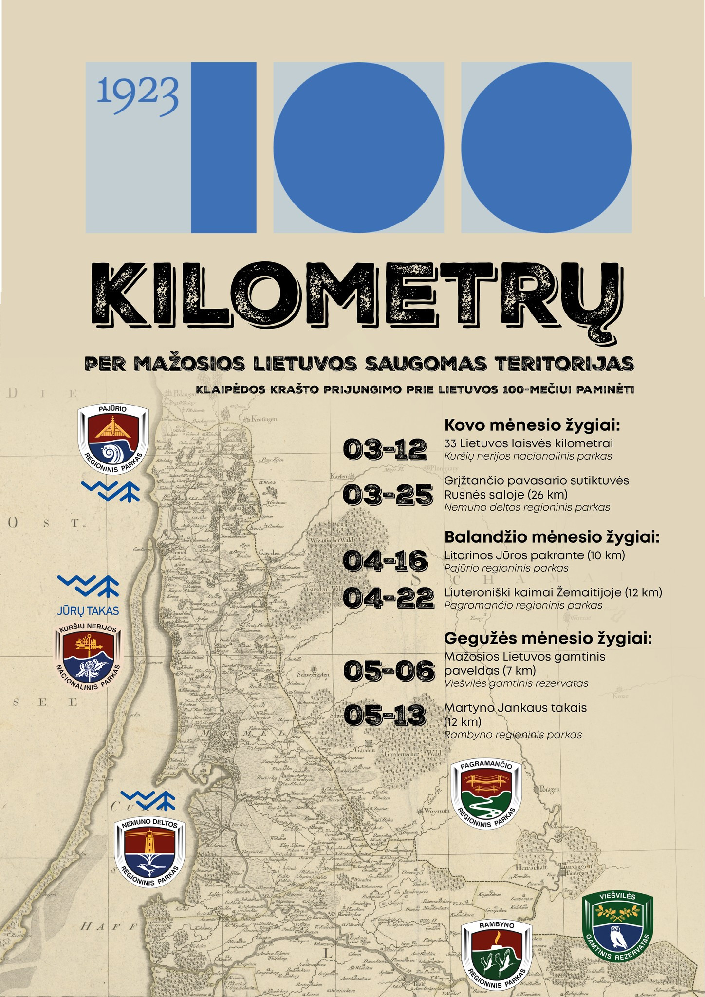 💛💚❤️Klaipėdos krašto prijungimo prie Lietuvos šimtmetį minėsime ilgai ir įsimintinai, įveikdami nuo kelių iki kelių dešimčių kilometrų skirtingose saugomose teritorijose. Visą pavasarį kviesime į savaitgalinius žygius Kuršių nerijos nacionaliniame ir šio krašto regioniniuose parkuose bei Viešvilės rezervate, kur dirbantys specialistai supažindins su kraštovaizdžio vertybėmis, vietos išskirtinumu, gamtos ir kultūros paveldu. Entuziastai, sudalyvavę visuose žygiuose, bus nukeliavę lygiai 100 kilometrų per Klaipėdos kraštą ir apdovanoti simbolinėmis atminimo dovanėlėmis.