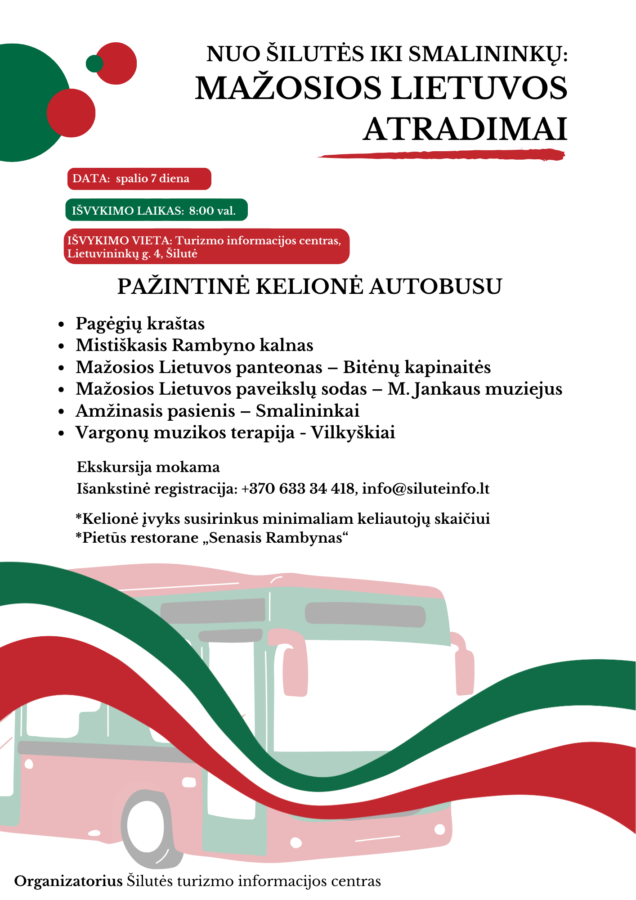Kviečiame į pažintinę ekskursiją autobusu po Mažąją Lietuvą, nuo Šilutės iki Smalininkų!Ekskursija planuojama 2023 m. spalio 7 d...