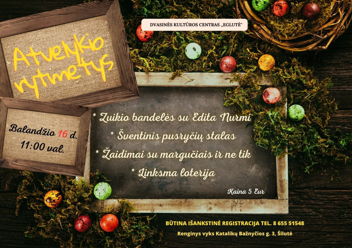 Balandžio 16 d. 11 val. dvasinės kultūros centras „Eglutė“ kviečia į Atvelykio rytmetį.Būtina išankstinė registracija tel. 8 655 51...