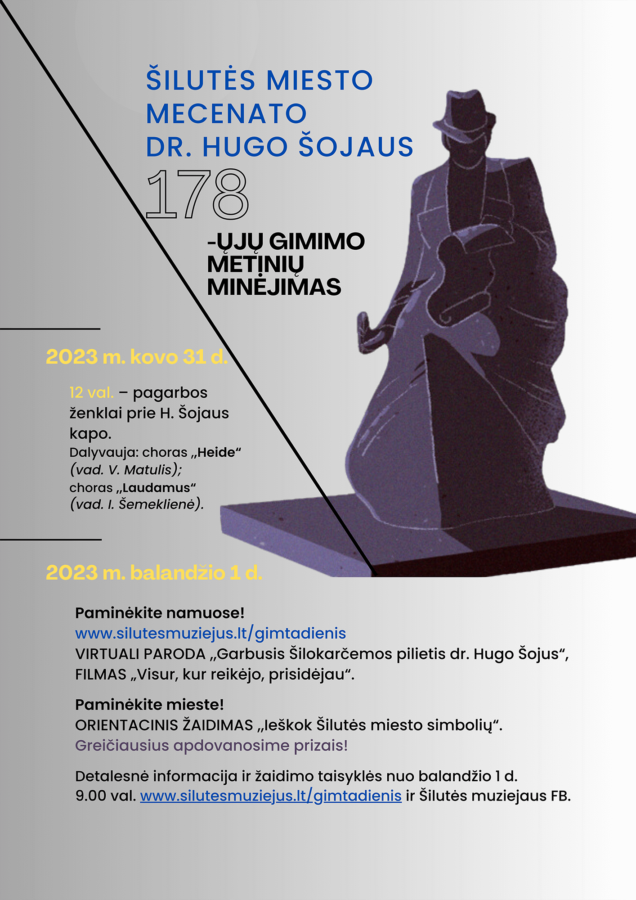 Minint Šilutės miesto mecenato dr. Hugo Šojaus 178-ąsias gimimo metines, Šilutės Hugo Šojaus muziejus kviečia dalyvauti šiai progai ski...