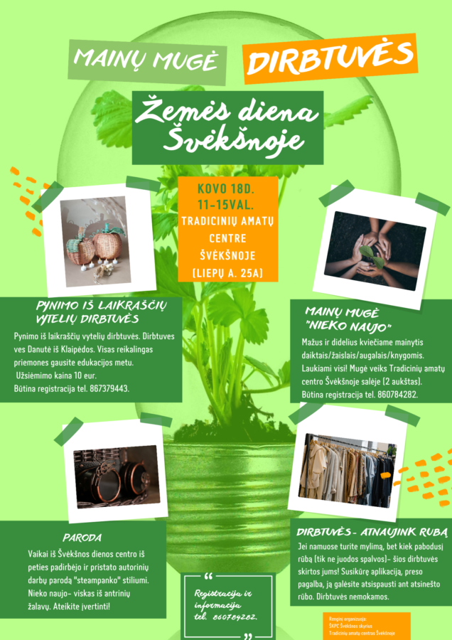 Kovo 18 d. Žemės dieną kviečiame švęsti Švėkšnoje!Švėkšnos tradicinių amatų centre žemės dienos proga, kurios tema šiemet – tvaruma...