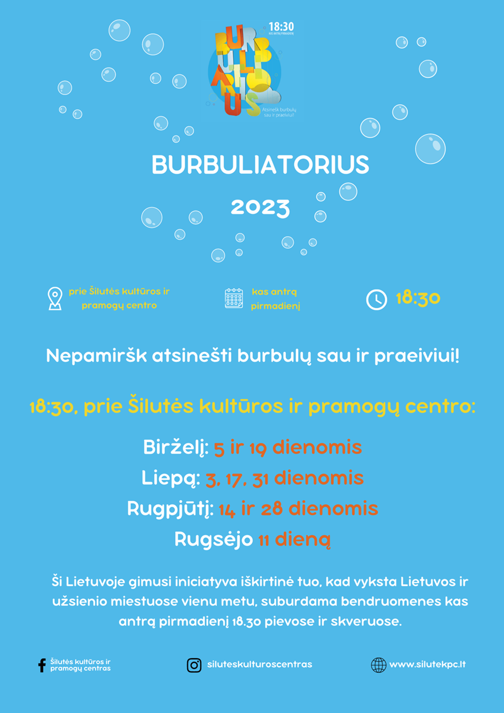 Kas antrą mėnesio pirmadienį (2023 m. birželio 19 d., liepos 3,17,31 d., rugpjūčio 14, 28 d., rugsėjo 11 d.) prie Šilutės kultūros ir pramogų centro vyks burbuliatorius. Ši Lietuvoje gimusi iniciatyva iškirtinė tuo, kad vyksta Lietuvos ir užsienio miestuose vienu metu, suburdama bendruomenes kas antrą pirmadienį 18.30 pievose ir skveruose. Praleiskite vasaros laisvalaikį kitaip, griebkite burbulus ir susitikime prie Šilutės kultūros ir pramogų centro. Kviečiame pasimėgauti vasara, muilo burbulais ir vieni kitų kompanija! Nepamirškite atsinešti muilo burbulų sau ir praeiviams!