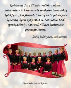Kviečiame balandžio 12 d., 16 val., į Šilutės trečiojo amžiaus universiteto ir Visuomenės sveikatos biuro šokių kolektyvo „Aukštumala“ 5-erių metų