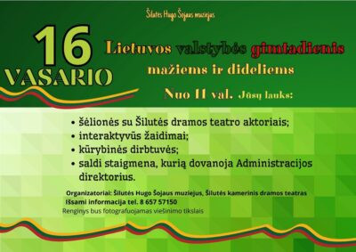 Susitikime vasario 16 d. 11 val. Šilutės Hugo Šojaus muziejuje (Lietuvininkų g. 4). Šėlsime su Šilutės kamerinio dramos teatro šauniaisiais