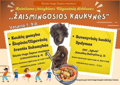 Vasario 1-9 d. kviečiame į kūrybines Užgavėnių dirbtuves „Žaismingosios kaukynės“ Šilutės Hugo Šojaus muziejuje (Lietuvininkų g. 4), kurių metu gaminsite