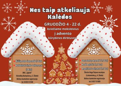 Gruodžio 4-22 d. kviečiame moksleivius turiningai praleisti laiką advento kūrybinėse dirbtuvėse: Užsiėmimai vyks DKC „Eglutė“ (Katalikų Bažnyčios g. 3, Šilutė).