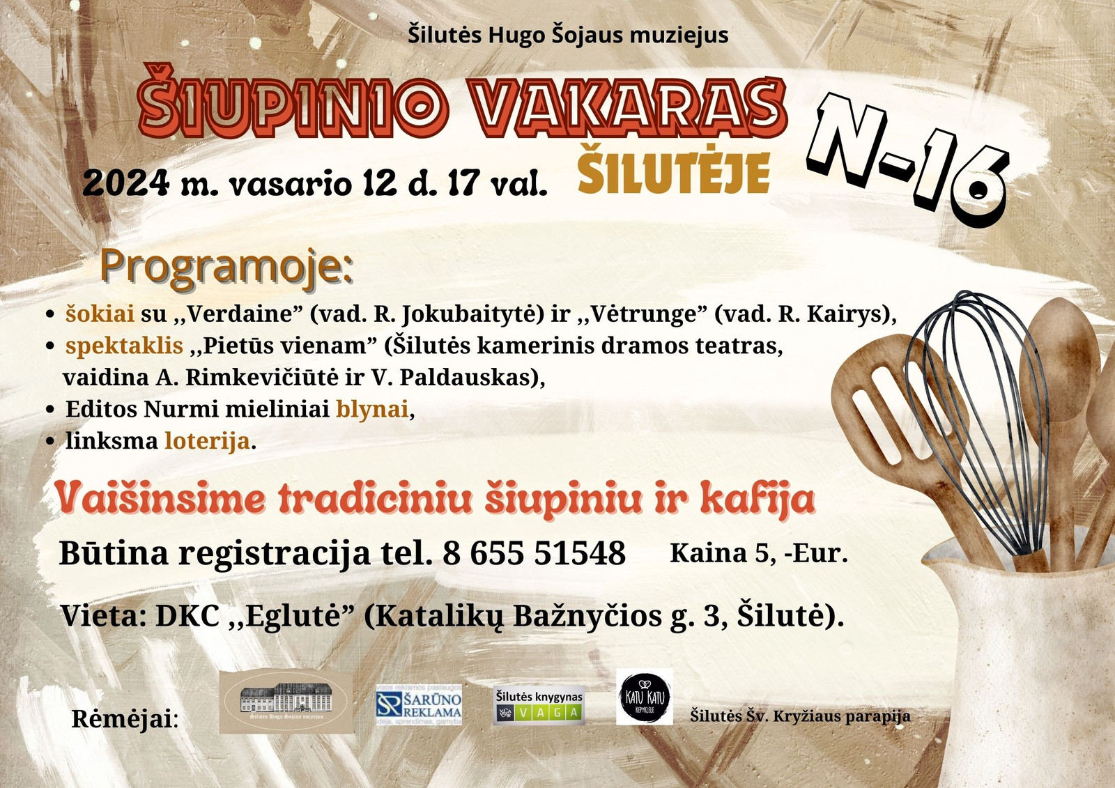 Vasario 12 d. 17 val. kviečiame į „Šiupinio vakarą Šilutėje“. Programoje Jūsų lauks: Šilutės kamerinio dramos teatro spektaklis „Pietūs vienam“ (vaidina A. Rimkevičiūtė ir V. Paldauskas); šokiai su folkloro ansambliu „Verdainė“ (vad. R. Jokubaitytė) ir kapela „Vėtrungė“ (vad. R. Kairys); Editos Nurmi mieliniai blynai; smagi loterija; skaniausi lietuvininkų valgiai: tradicinis šiupinys ir kafija.